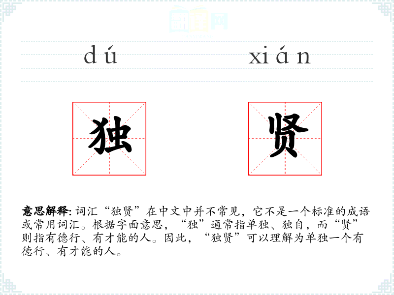 词汇“独贤”在中文中并不常见,它不是一个标准的成语或常用词汇。根据字面意思,“独”通常指单独、独自,而“贤”则指有德行、有才能的人。因此,“独贤”可以理解为单独一个有德行、有才能的人。