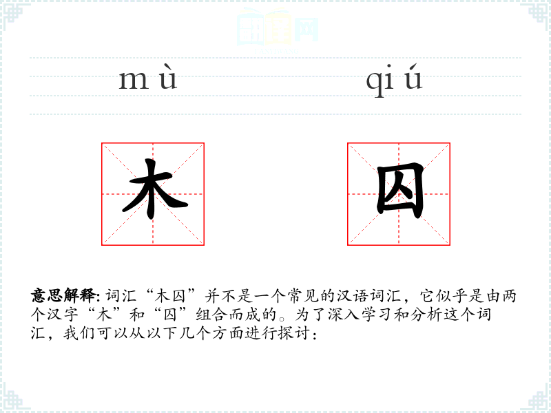 词汇“木囚”并不是一个常见的汉语词汇,它似乎是由两个汉字“木”和“囚”组合而成的。为了深入学习和分析这个词汇,我们可以从以下几个方面进行探讨:
