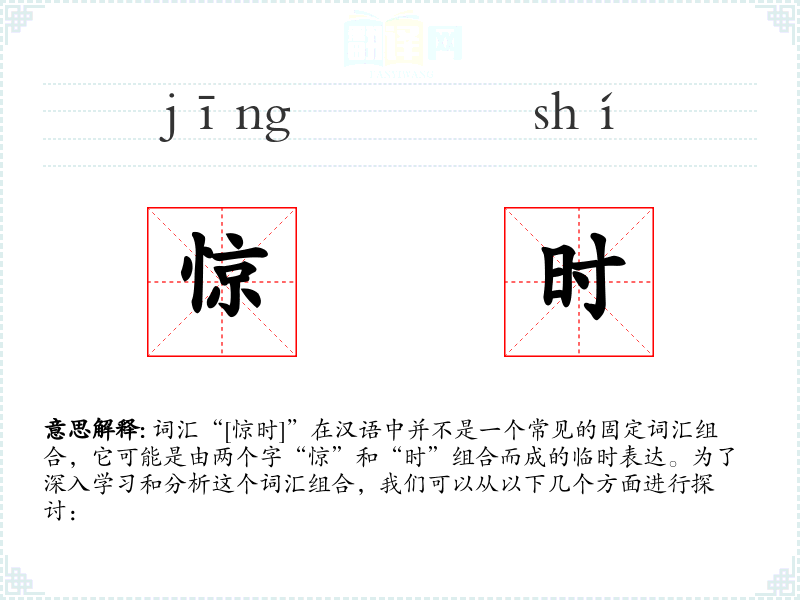 词汇“[惊时]”在汉语中并不是一个常见的固定词汇组合,它可能是由两个字“惊”和“时”组合而成的临时表达。为了深入学*和分析这个词汇组合,我们可以从以下几个方面进行探讨: