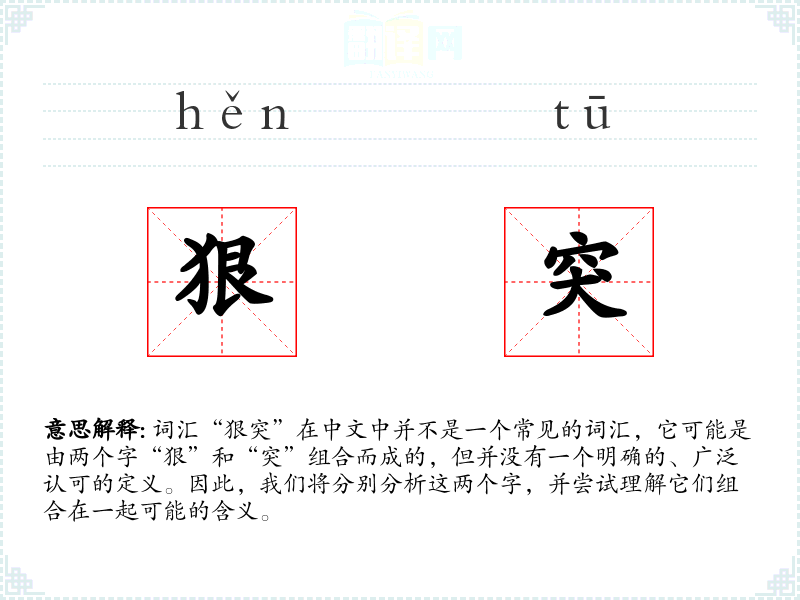 由于“狠突”不是一个标准词汇,它在不同语言或文化中的对应词汇可能不存在。但可以比较“狠”和“突”这两个字在其他语言中的对应词汇,如英语中的“fierce”和“sudden”。