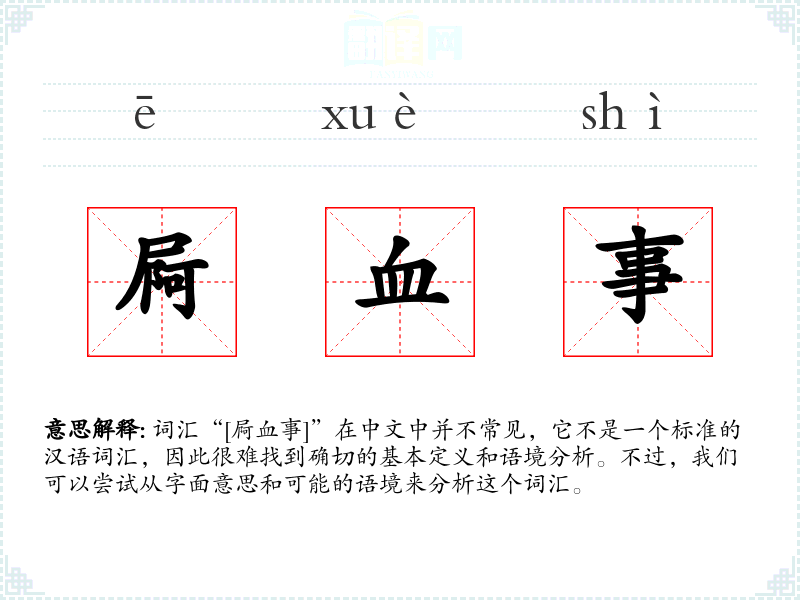 “屙”字在古代汉语中已有使用,而“血事”则是一个较为普通的词汇组合。这个词汇组合可能是在特定文献或方言中形成的,但在现代汉语中并未广泛使用。