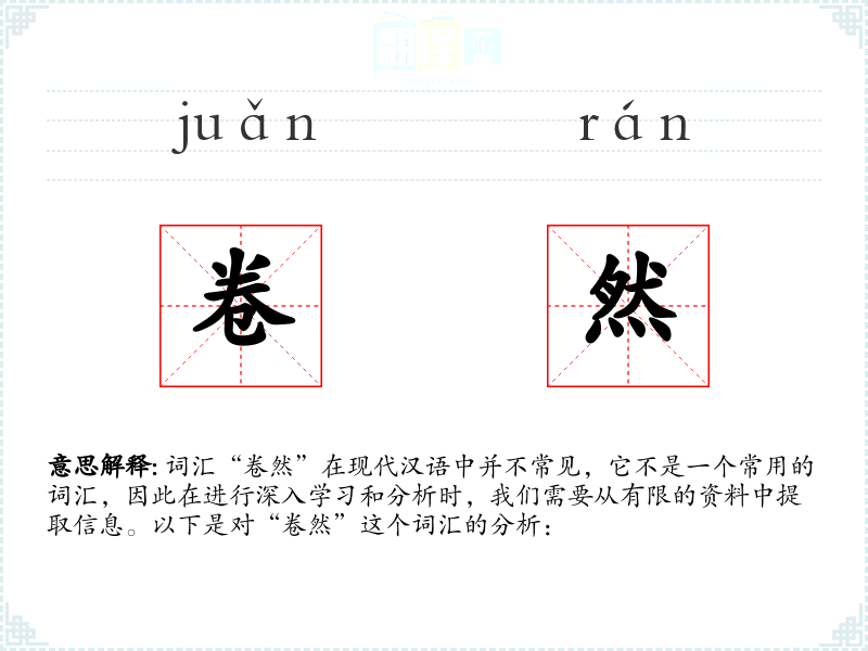 词汇“卷然”在现代汉语中并不常见,它不是一个常用的词汇,因此在进行深入学习和分析时,我们需要从有限的资料中提取信息。以下是对“卷然”这个词汇的分析: