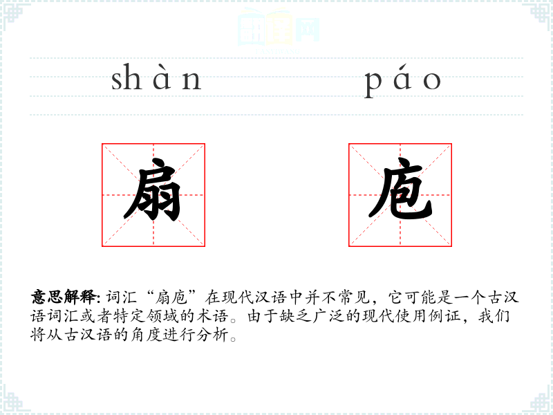 词汇“扇庖”在现代汉语中并不常见,它可能是一个古汉语词汇或者特定领域的术语。由于缺乏广泛的现代使用例证,我们将从古汉语的角度进行分析。