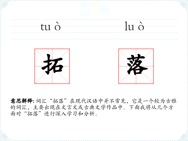 词汇“拓落”在现代汉语中并不常见,它是一个较为古雅的词汇,主要出现在文言文或古典文学作品中。下面我将从几个方面对“拓落”进行深入学*和分析。