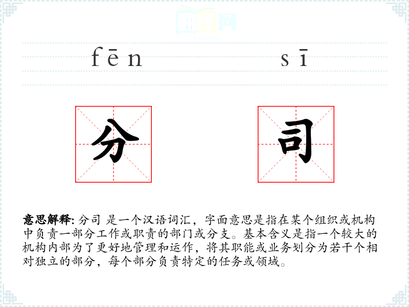 分司 这个词在描述组织结构时非常有用,它帮助我们理解复杂机构内部的分工和职责。在语言学*和表达中,掌握这样的专业词汇有助于更精确地沟通和交流。