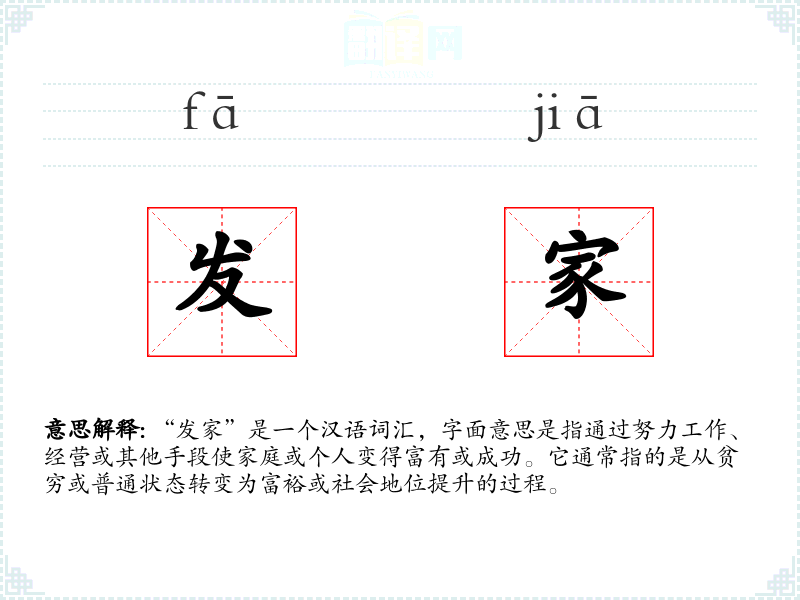 “发家”是一个汉语词汇,字面意思是指通过努力工作、经营或其他手段使家庭或个人变得富有或成功。它通常指的是从贫穷或普通状态转变为富裕或社会地位提升的过程。
