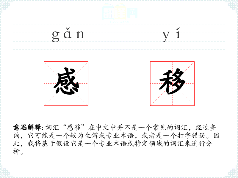 词汇“感移”在中文中并不是一个常见的词汇,经过查询,它可能是一个较为生僻或专业术语,或者是一个打字错误。因此,我将基于假设它是一个专业术语或特定领域的词汇来进行分析。