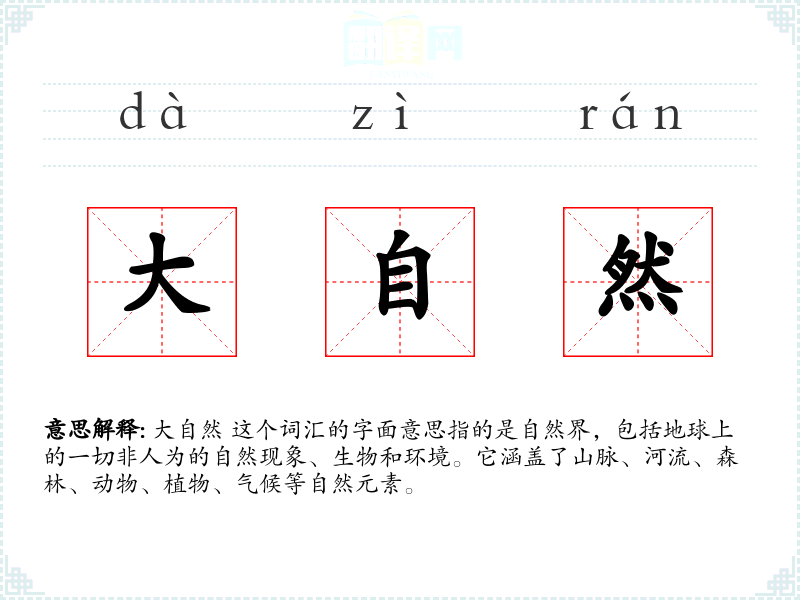 大自然 这个词汇的字面意思指的是自然界,包括地球上的一切非人为的自然现象、生物和环境。它涵盖了山脉、河流、森林、动物、植物、气候等自然元素。