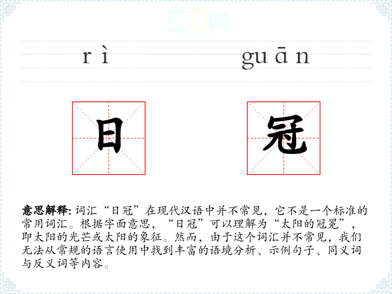 由于“日冠”不是一个标准词汇,我们无法提供详细的词源与演变、文化与社会背景分析、情感与联想、个人应用、创造性使用、视觉与听觉联想以及跨文化比较等内容。