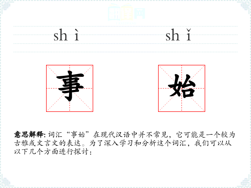 词汇“事始”在现代汉语中并不常见,它可能是一个较为古雅或文言文的表达。为了深入学*和分析这个词汇,我们可以从以下几个方面进行探讨: