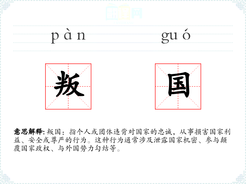 叛国:指个人或团体违背对国家的忠诚,从事损害国家利益、安全或尊严的行为。这种行为通常涉及泄露国家机密、参与颠覆国家政权、与外国势力勾结等。