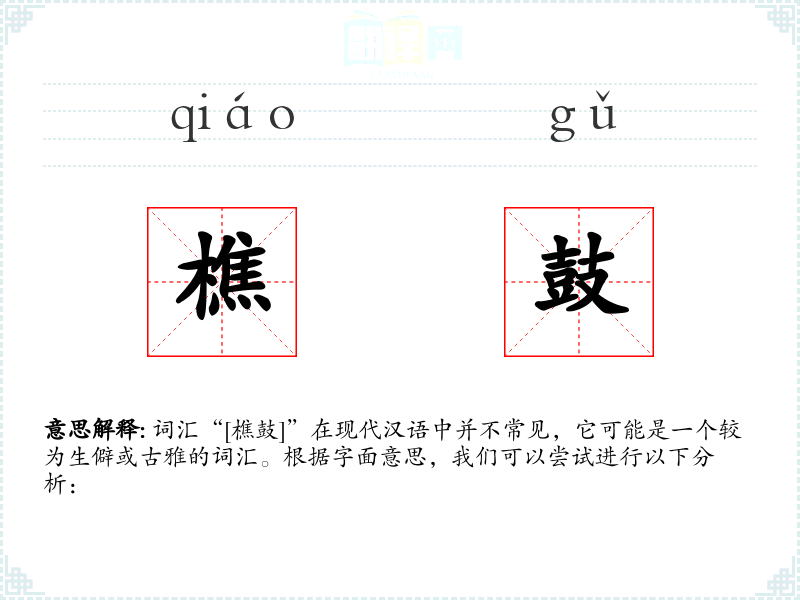 词汇“[樵鼓]”在现代汉语中并不常见,它可能是一个较为生僻或古雅的词汇。根据字面意思,我们可以尝试进行以下分析: