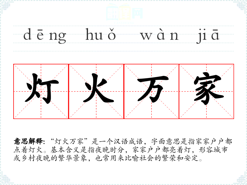 “灯火万家”是一个汉语成语,字面意思是指家家户户都点着灯火。基本含义是指夜晚时分,家家户户都亮着灯,形容城市或乡村夜晚的繁华景象,也常用来比喻社会的繁荣和安定。