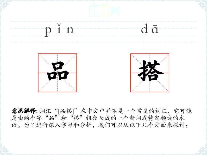 词汇“[品搭]”在中文中并不是一个常见的词汇,它可能是由两个字“品”和“搭”组合而成的一个新词或特定领域的术语。为了进行深入学习和分析,我们可以从以下几个方面来探讨: