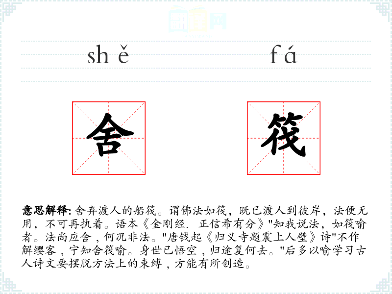 1.舍弃渡人的船筏。谓佛法如筏,既已渡人到彼岸,法便无用,不可再执着。语本《金刚经.正信希有分》"知我说法,如筏喻者。法尚应舍﹐何况非法。"唐钱起《归义寺题震上人壁》诗"不作解缨客﹐宁知舍筏喻。身世已悟空﹐归途复何去。"后多以喻学习古人诗文要摆脱方法上的束缚﹐方能有所创造。