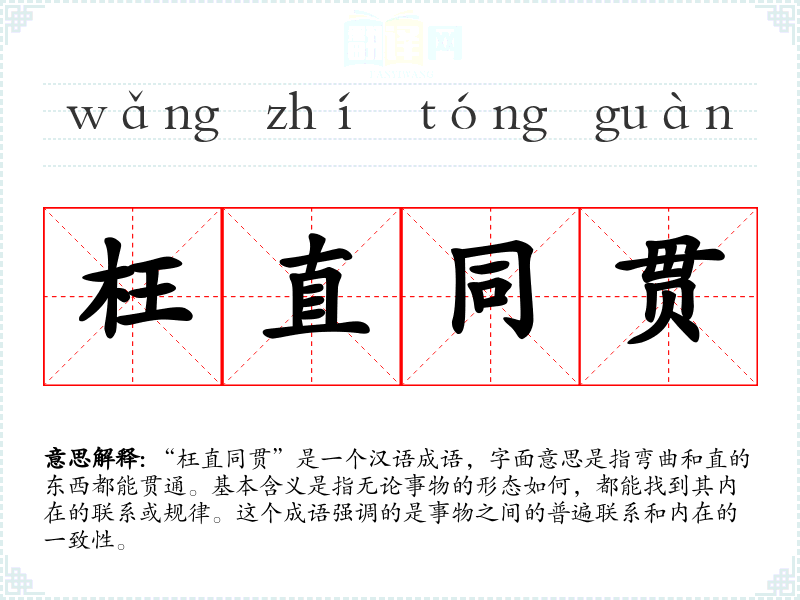 “枉直同贯”是一个汉语成语,字面意思是指弯曲和直的东西都能贯通。基本含义是指无论事物的形态如何,都能找到其内在的联系或规律。这个成语强调的是事物之间的普遍联系和内在的一致性。