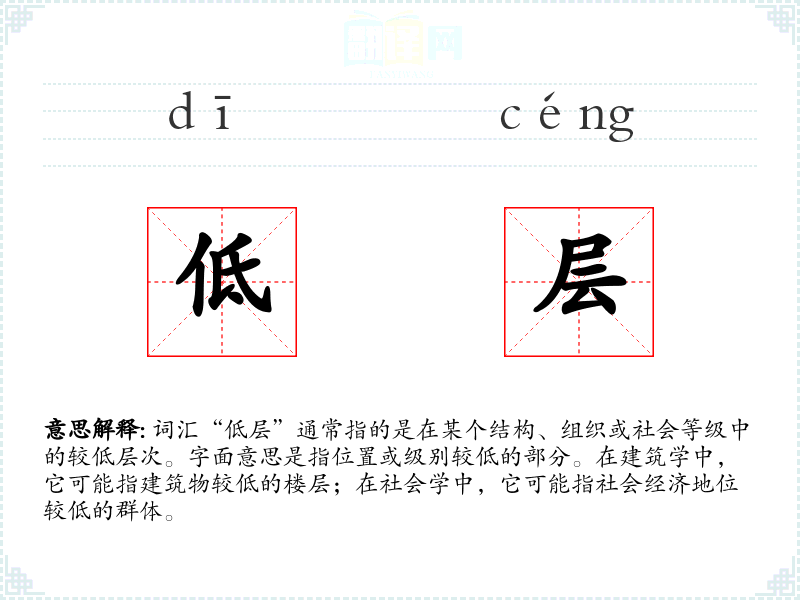 “低层”一词源自汉语,由“低”和“层”两个字组成。在古代汉语中,“低”表示位置或程度较低,“层”表示层次或级别。随着社会的发展,这个词在不同领域中逐渐扩展了其含义。