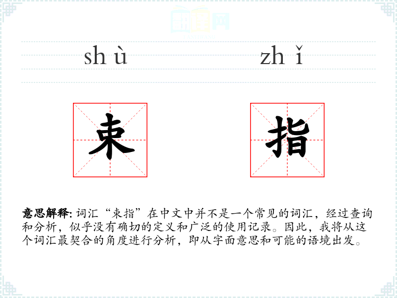 由于“束指”不是一个常用词汇,它在不同语境下的使用非常有限。可能在一些特定的文学作品或专业领域中会有所提及,但具体情况需要具体分析。