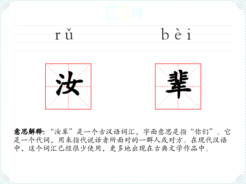 “汝辈”是一个古汉语词汇,字面意思是指“你们”。它是一个代词,用来指代说话者所面对的一群人或对方。在现代汉语中,这个词汇已经很少使用,更多地出现在古典文学作品中。