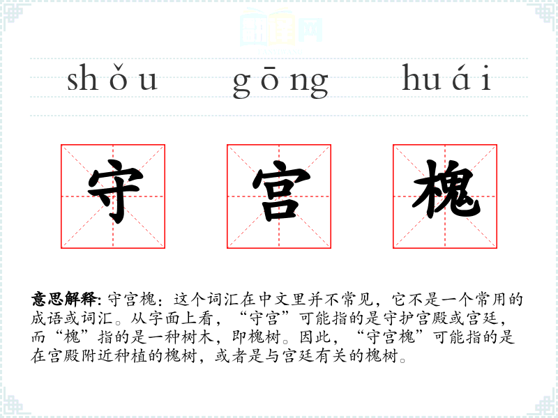 “守宫槐”这个词汇的词源并不明确,它可能是由“守宫”和“槐”两个词汇组合而成,用来描述特定场景中的槐树。在语言的演变中,这个词汇可能并没有发生太大的变化,因为它不是一个常用的词汇。