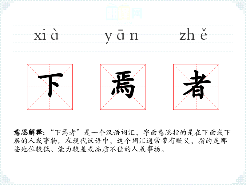 “下焉者”是一个汉语词汇,字面意思指的是在下面或下层的人或事物。在现代汉语中,这个词汇通常带有贬义,指的是那些地位较低、能力较差或品质不佳的人或事物。