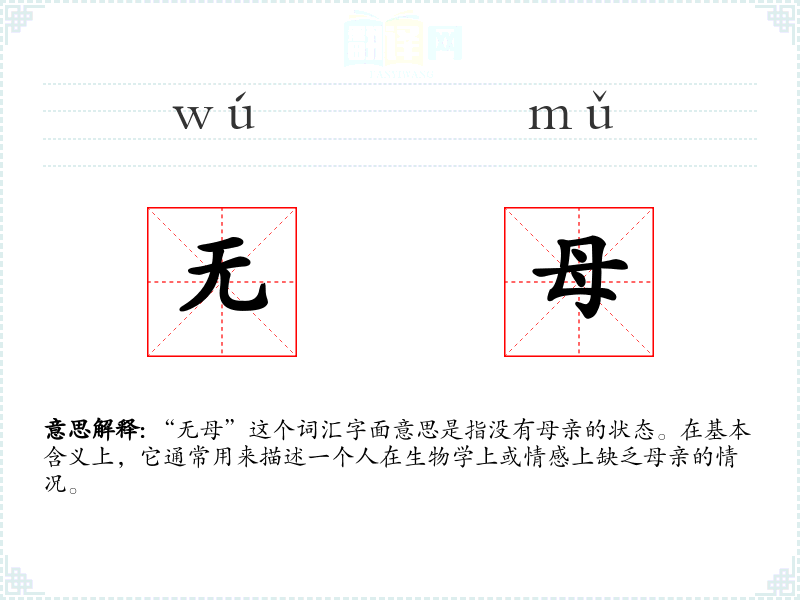 “无母”这个词汇字面意思是指没有母亲的状态。在基本含义上,它通常用来描述一个人在生物学上或情感上缺乏母亲的情况。