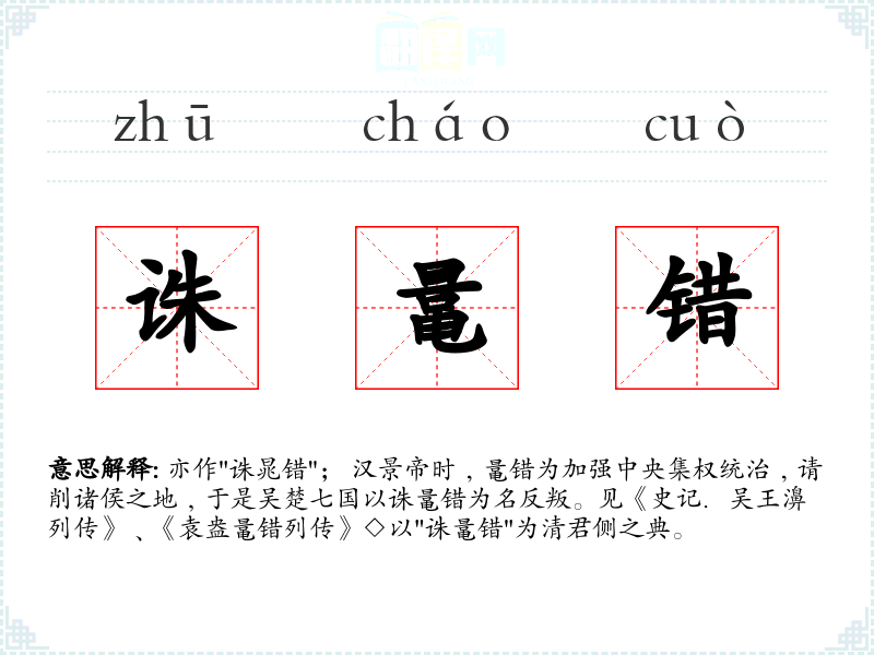 亦作"诛晁错"; 汉景帝时﹐鼌错为加强中央集权统治﹐请削诸侯之地﹐于是吴楚七国以诛鼌错为名反叛。见《史记.吴王濞列传》﹑《袁盎鼌错列传》◇以"诛鼌错"为