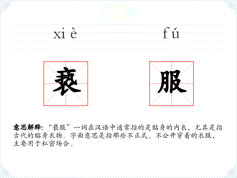 “亵服”一词在汉语中通常指的是贴身的内衣,尤其是指古代的贴身衣物。字面意思是指那些不正式、不公开穿着的衣服,主要用于私密场合。