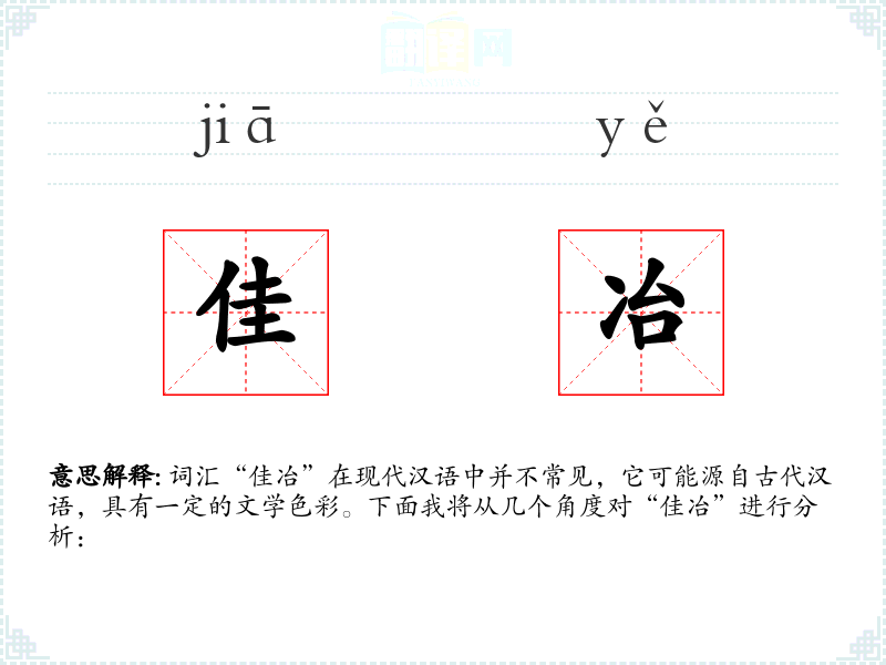词汇“佳冶”在现代汉语中并不常见,它可能源自古代汉语,具有一定的文学色彩。下面我将从几个角度对“佳冶”进行分析: