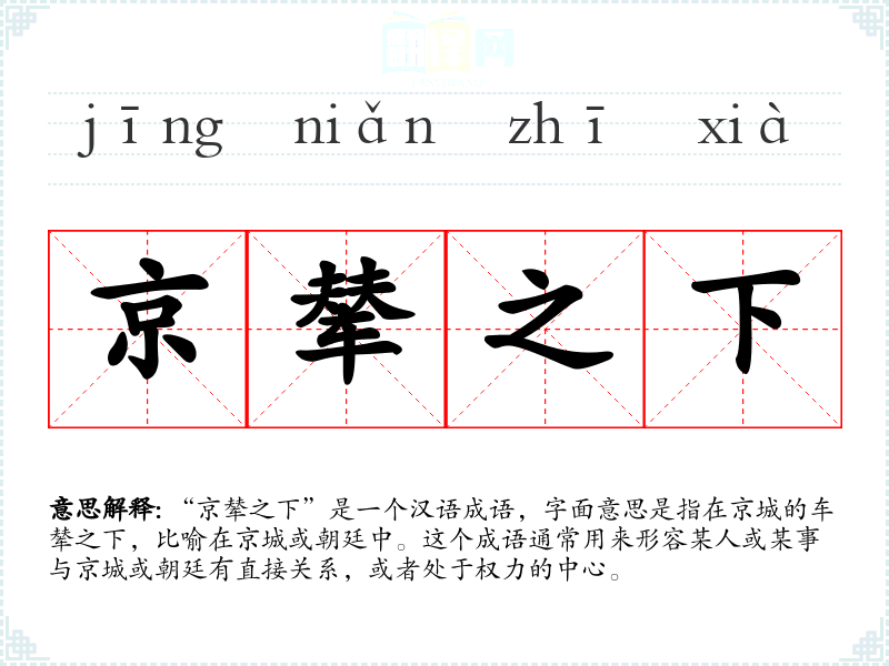 在文学作品中,“京辇之下”常用来描绘人物的身份地位,或者暗示故事背景与朝廷有关。在口语中,这个成语可能不太常用,但在历史或政治讨论中,它可能会被提及,用以强调某**或人物与中央政府的关联。