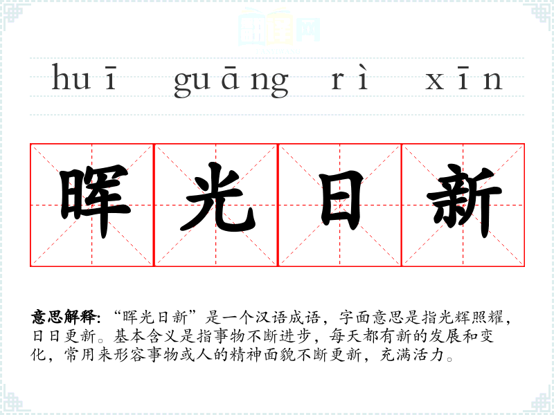 “晖光日新”源自《易经》中的“日新之谓盛德”,强调每天都有新的进步和变化。随着时间的推移,这个成语被广泛应用于各种语境,强调持续的进步和更新。