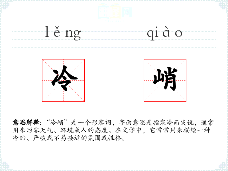 “冷峭”是一个形容词,字面意思是指寒冷而尖锐,通常用来形容天气、环境或人的态度。在文学中,它常常用来描绘一种冷酷、严峻或不易接近的氛围或性格。