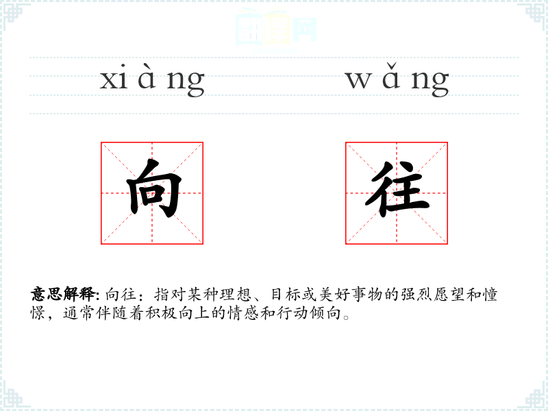 “向往”一词由“向”和“往”组成,“向”表示方向,“往”表示前进或趋向。在古代汉语中,“向往”已有使用,但随着时间的推移,其含义逐渐丰富,更多地与情感和心理状态相关联。