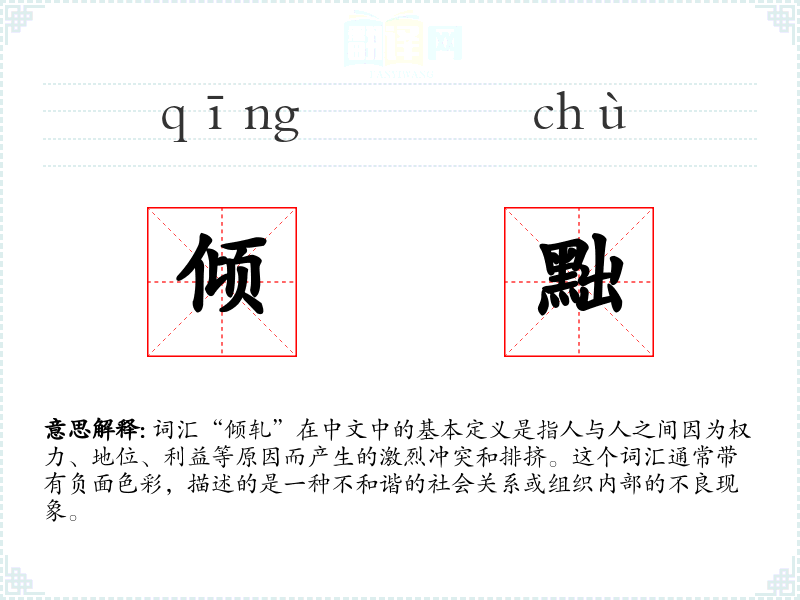 词汇“倾轧”在中文中的基本定义是指人与人之间因为权力、地位、利益等原因而产生的激烈冲突和排挤。这个词汇通常带有负面色彩,描述的是一种不和谐的社会关系或组织内部的不良现象。