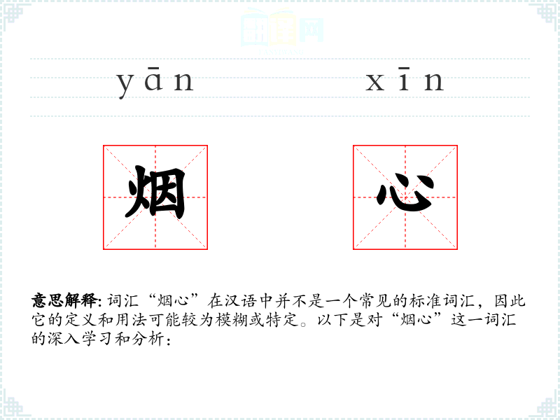 “烟心”作为一个非标准词汇,其含义和用法可能较为模糊和特定。在语言学习和表达中,它可能不是一个常用或重要的词汇,但在某些特定的文学或艺术创作中,它可以用来形容某种朦胧、迷离的情感状态,具有一定的创造性和表现力。