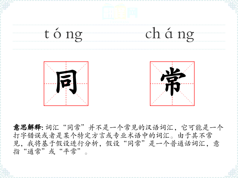 词汇“同常”并不是一个常见的汉语词汇,它可能是一个打字错误或者是某个特定方言或专业术语中的词汇。由于其不常见,我将基于假设进行分析,假设“同常”是一个普通话词汇,意指“通常”或“平常”。