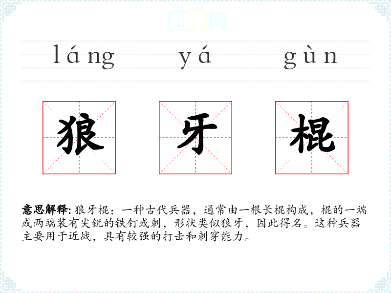 狼牙棍:一种古代兵器,通常由一根长棍构成,棍的一端或两端装有尖锐的铁钉或刺,形状类似狼牙,因此得名。这种兵器主要用于近战,具有较强的打击和刺穿能力。