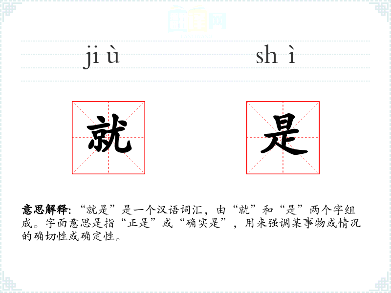 “就是”是一个汉语词汇,由“就”和“是”两个字组成。字面意思是指“正是”或“确实是”,用来强调某事物或情况的确切性或确定性。
