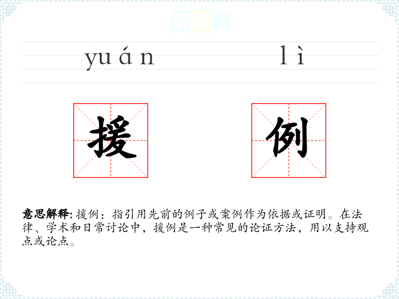 援例:指引用先前的例子或案例作为依据或证明。在法律、学术和日常讨论中,援例是一种常见的论证方法,用以支持观点或论点。