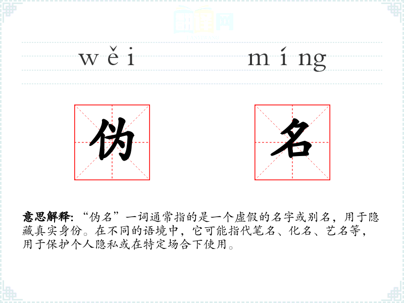 “伪名”一词通常指的是一个虚假的名字或别名,用于隐藏真实身份。在不同的语境中,它可能指代笔名、化名、艺名等,用于保护个人隐私或在特定场合下使用。