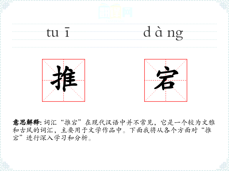 词汇“推宕”在现代汉语中并不常见,它是一个较为文雅和古风的词汇,主要用于文学作品中。下面我将从各个方面对“推宕”进行深入学*和分析。