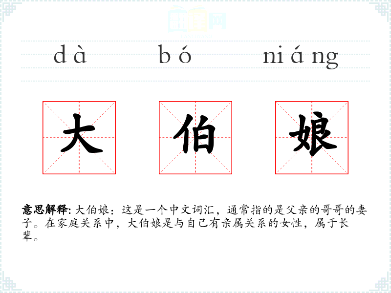 大伯娘:这是一个中文词汇,通常指的是父亲的哥哥的妻子。在家庭关系中,大伯娘是与自己有亲属关系的女性,属于长辈。