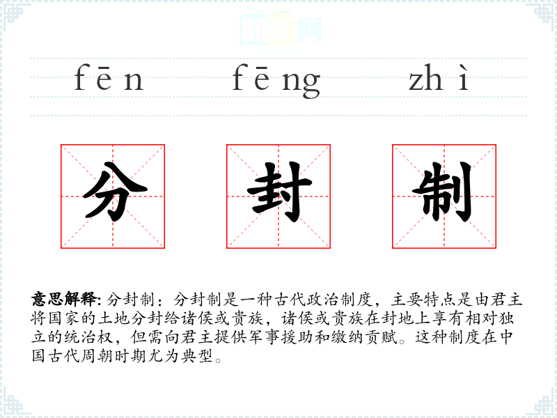 - 同义词:封建制(在某些语境下可以互换使用,但封建制更广义,包括了分封制之外的其他封建特征)