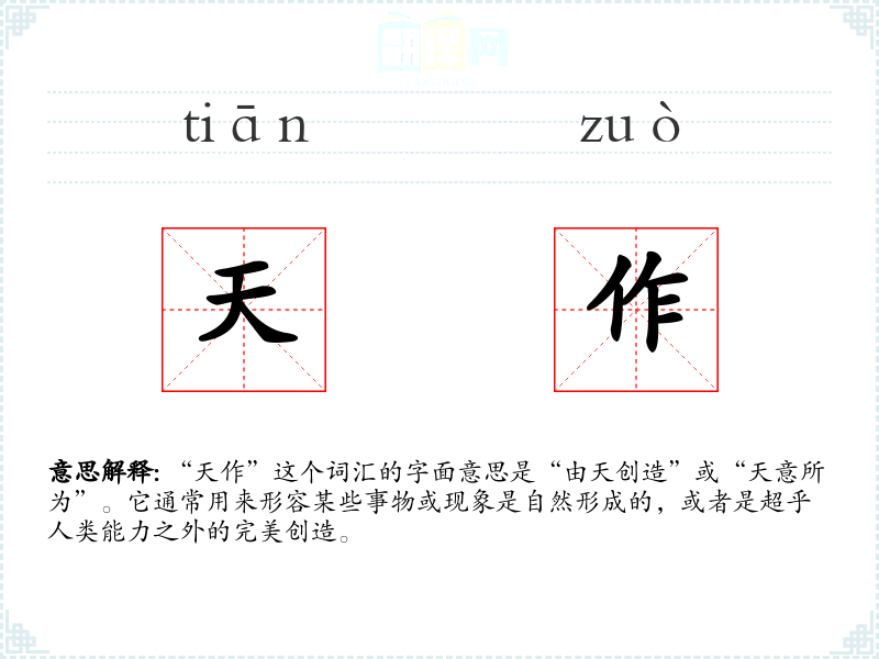 “天作”这个词汇的字面意思是“由天创造”或“天意所为”。它通常用来形容某些事物或现象是自然形成的,或者是超乎人类能力之外的完美创造。