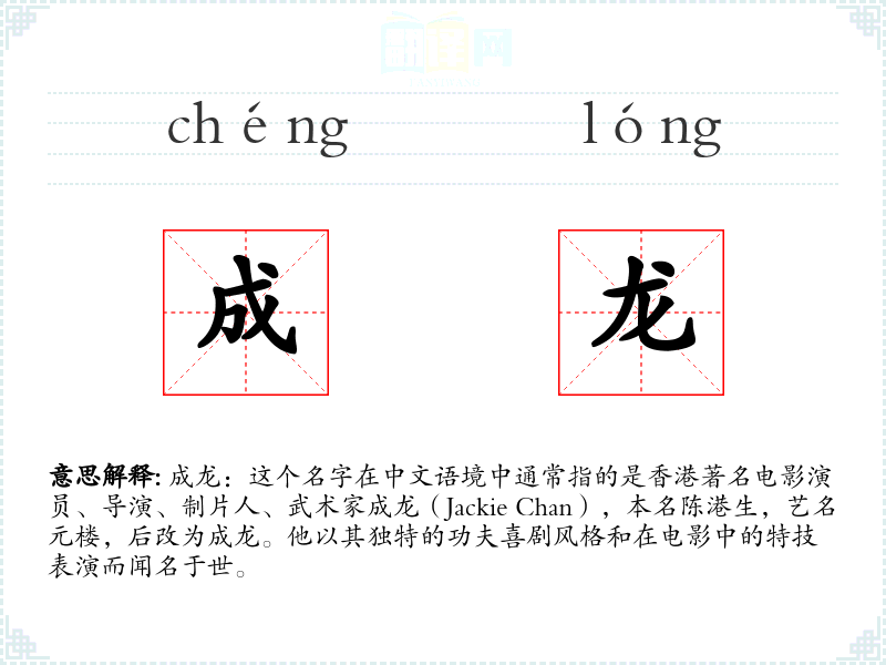 成龙的名字源自他的艺名,而“成龙”在中文中有着“成为龙”的寓意,象征着成功和卓越。他的职业生涯从武术学校开始,逐渐转型为电影演员,并在国际上取得了巨大成功。