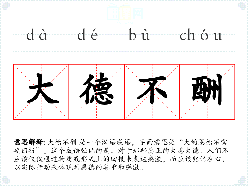 在传统文化中,大德不酬** 体现了儒家思想中的“仁”和“义”,强调人与人之间的道德义务和情感联系。在现代社会,这个成语仍然被用来教育人们要懂得感恩和回报,但更重要的是要以实际行动来体现对他人恩德的尊重。