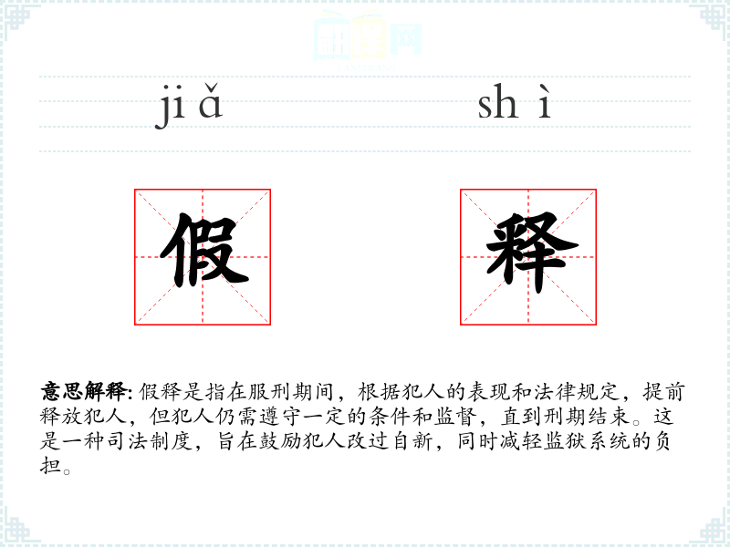 "假释"的意思解释、假释是什么意思由翻译网汉语词典查词提供。