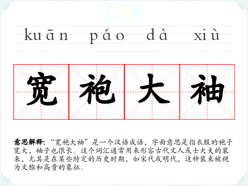 “宽袍大袖”是一个汉语成语,字面意思是指衣服的袍子宽大,袖子也很长。这个词汇通常用来形容古代文人或士大夫的装束,尤其是在某些特定的历史时期,如宋代或明代,这种装束被视为文雅和高贵的象征。