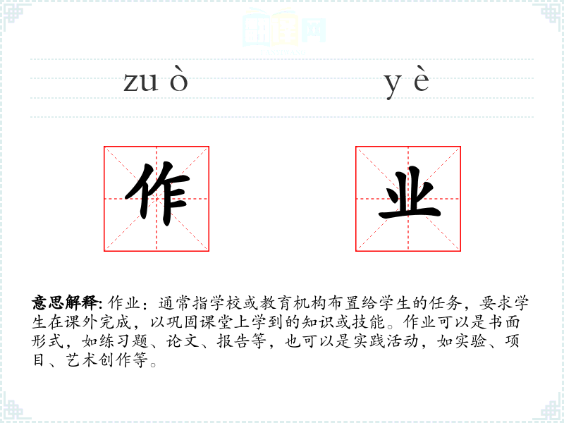 作业一词源自汉语,古汉语中已有“作业”一词,原指劳作或工作,后逐渐演变为指学生的学任务。在现代汉语中,作业主要指学生的课外学任务。