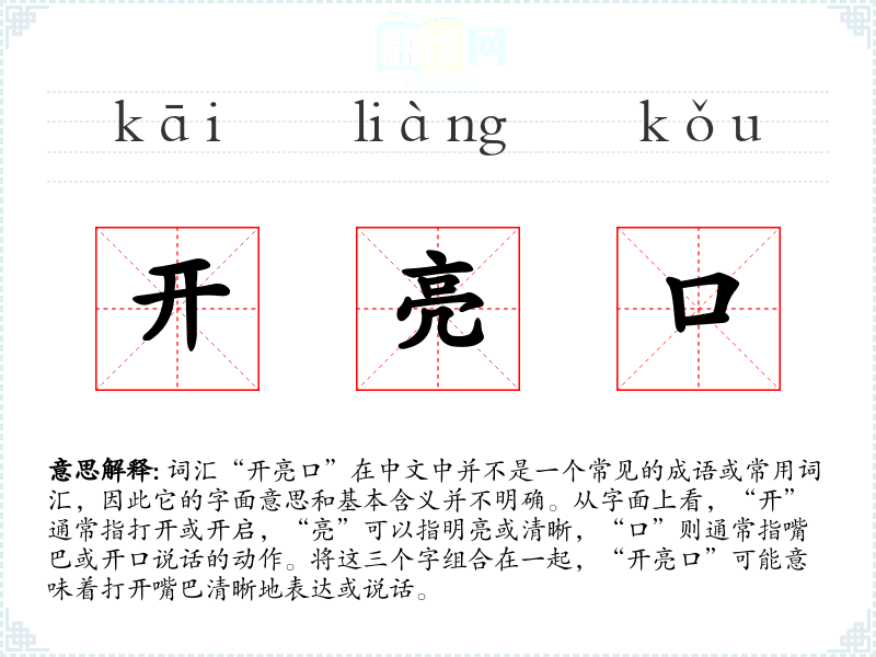 “开亮口”这个词组虽然不是一个常用词汇,但它可以用来形容清晰、直接的沟通方式。在语言学习和表达中,理解并适当使用这样的词汇可以丰富表达方式,增强沟通的效果。